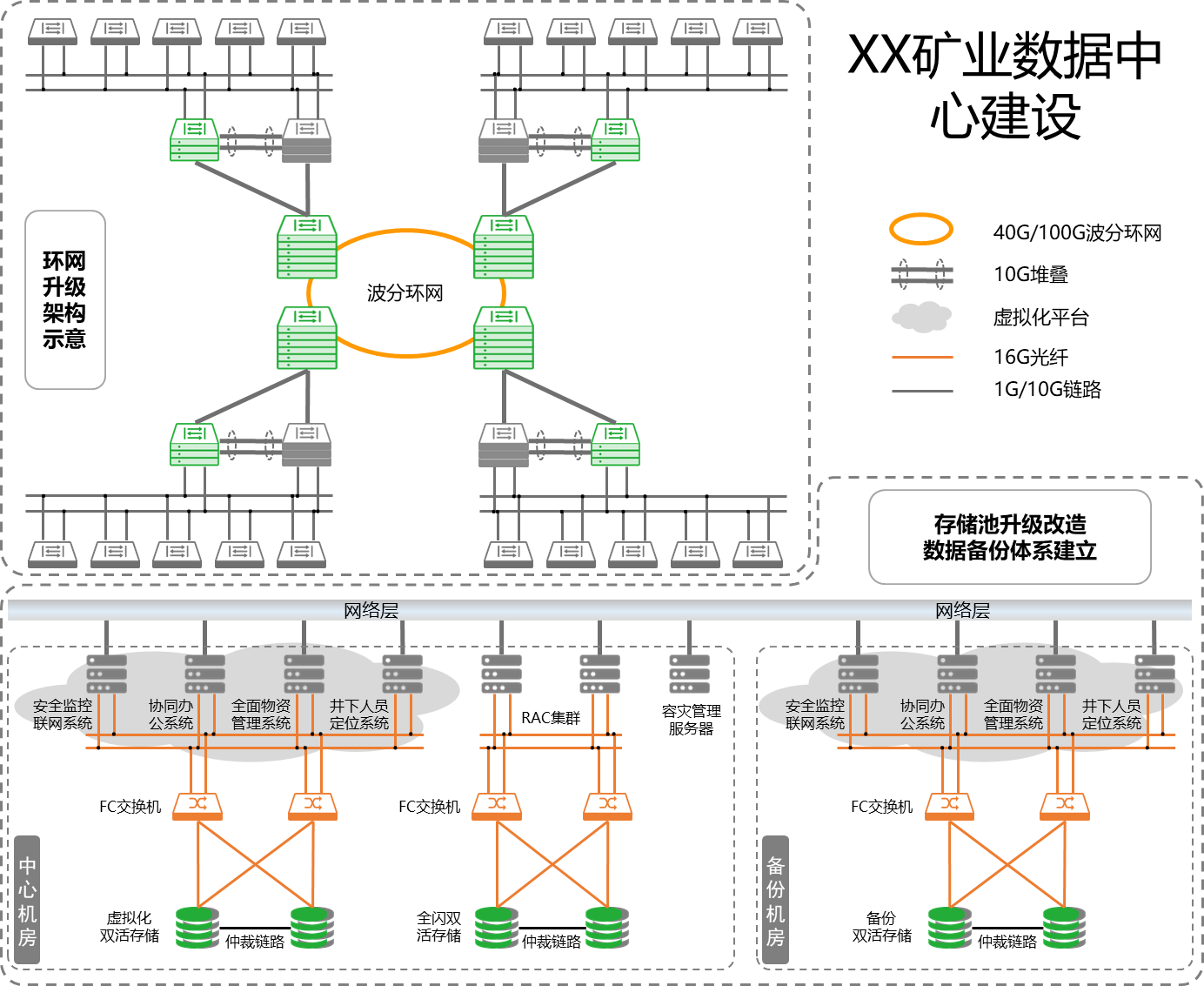 2、存储池升级改造:分别对数据中心和灾备中心进行存储升级,实现存储设备新老更替,业务系统无中断数据迁移,并建立一套资源统一管理、大容量高性能的数据中心存储体系;